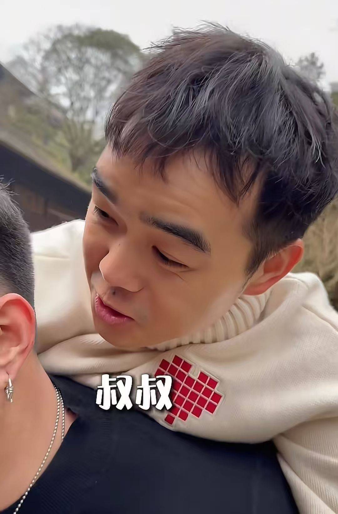 烧饼背着小岳岳徒弟,孩子贴在他肩头,羞怯地喊了声“叔叔”;